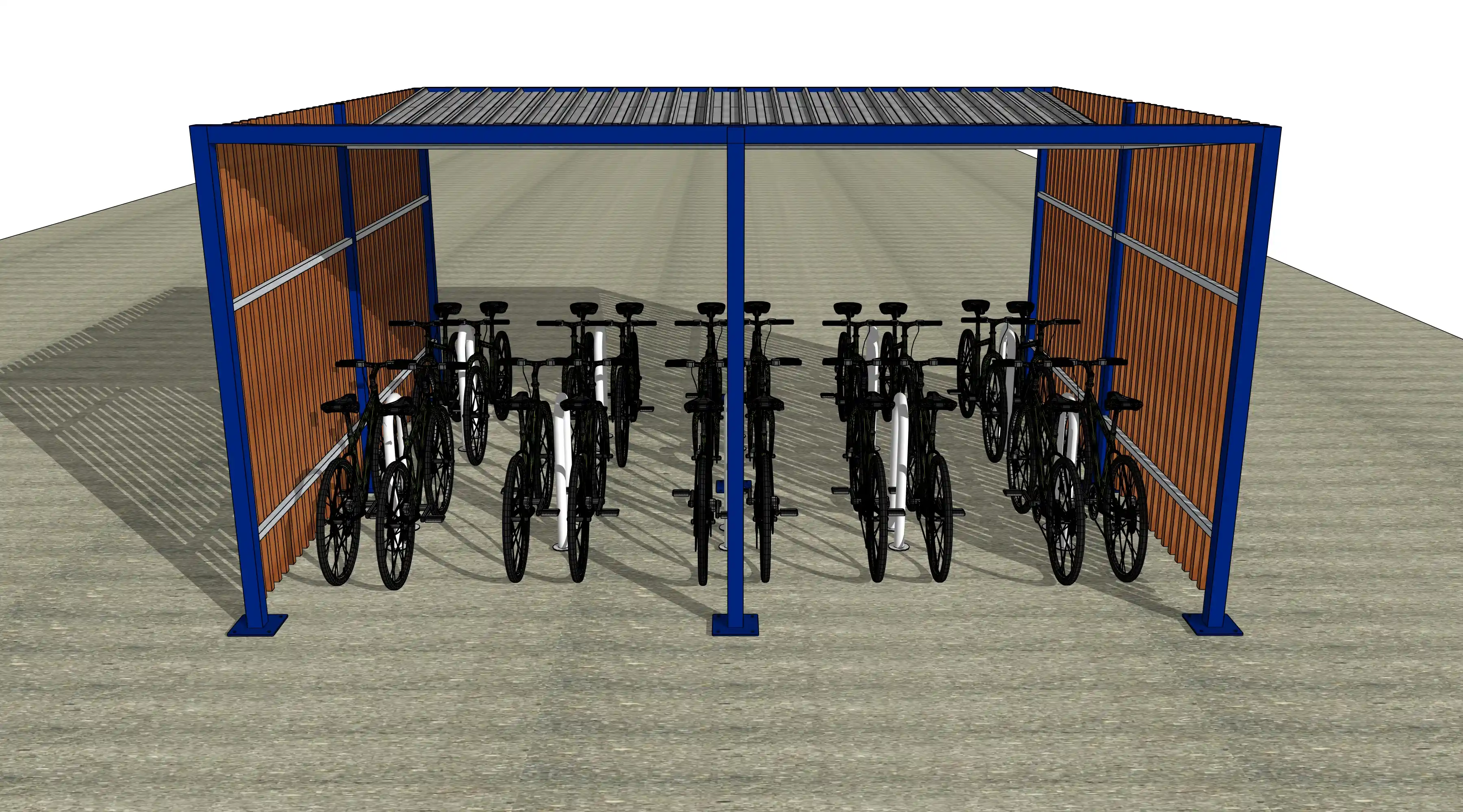 Avec une profondeur exceptionnelle de 4m60, la toiture débordante couvre intégralement les vélos stationnés des deux côtés. Contrairement aux abris standards, cette profondeur garantit une protection réelle et efficace contre la pluie, même avec du vent.